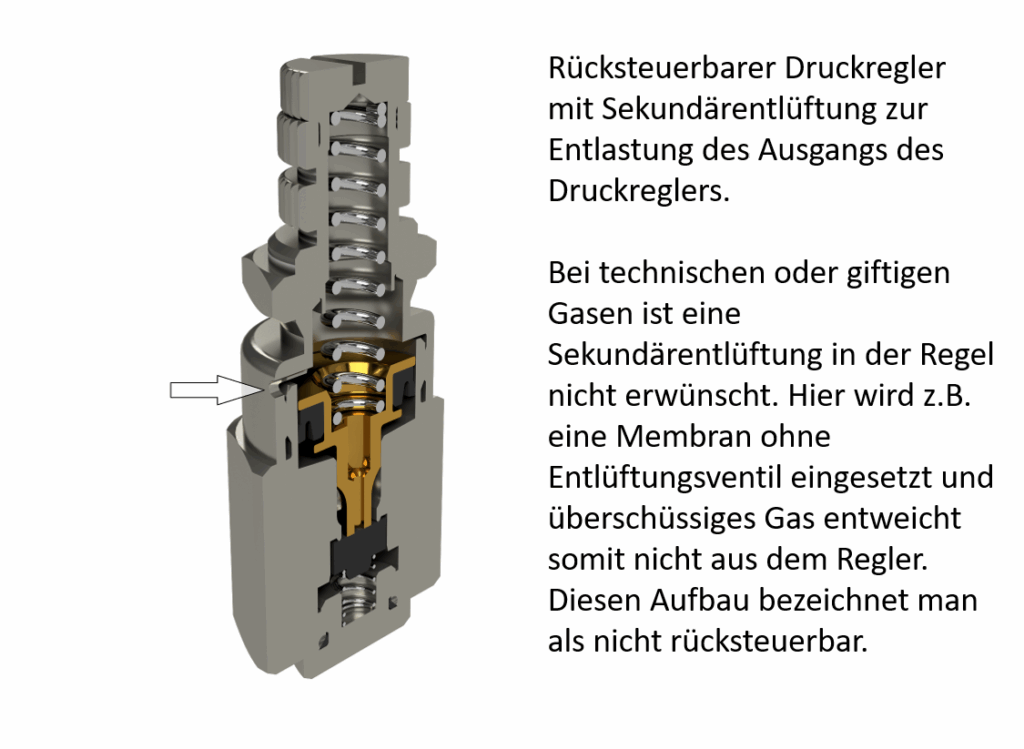 Anders sieht es jedoch bei gefährlichen Gasen oder Flüssigkeiten aus. Hier darf ein unbeabsichtigtes Entlüften aus sicherheits- und umwelttechnischen Gründen keinesfalls erfolgen. In solchen Fällen kommt ein Druckregler ohne Sekundärentlüftung zum Einsatz. Dieser verschließt die Sekundärseite vollständig und verhindert so jegliches Austreten des Mediums.