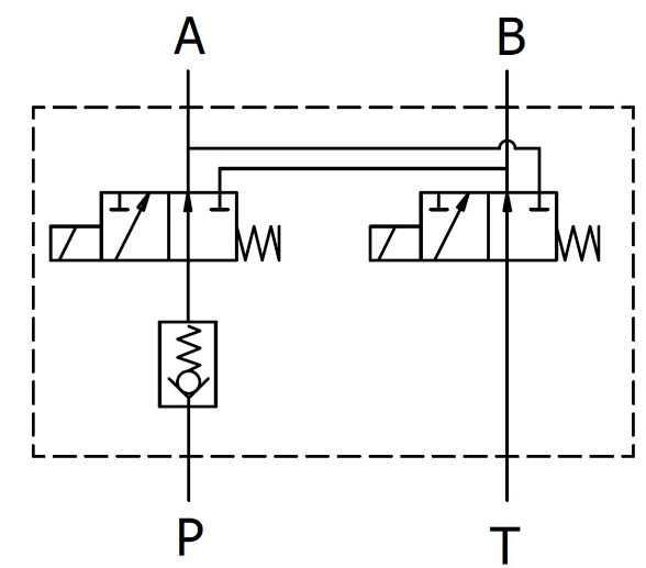 The realization is carried out in such a way that two 3/2-way solenoid valves are integrated into one valve manifold, and the inlets, outlets, and exhaust ports are interconnected according to the schematic shown below. The schematic additionally includes a check valve, which is also integrated into the same valve manifold.