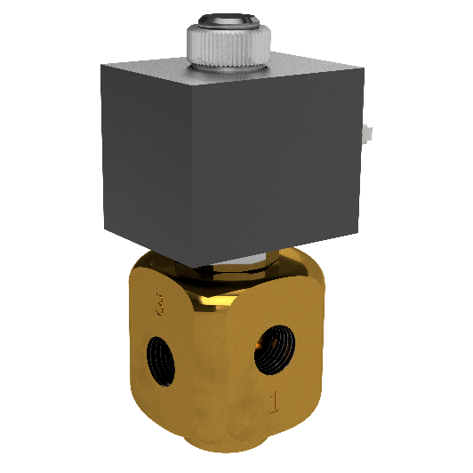 The 3/2-way valve components used are not the standard version with one port on the guide tube, but rather a special design in which all ports are integrated into the valve body. A single valve in this special design is shown in the following illustration of a brass valve.